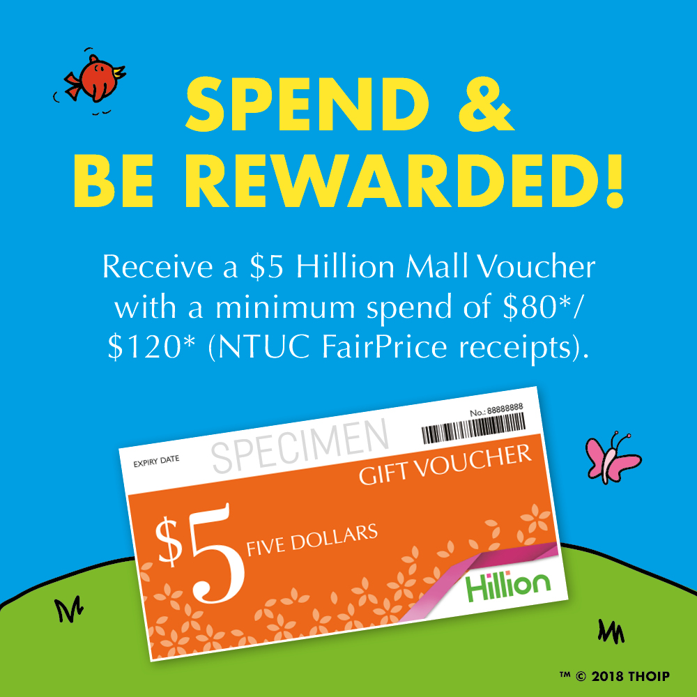 Spend a minimum of $80* or $120* (NTUC FairPrice receipts) to redeem a $5 Hillion Mall voucher!
